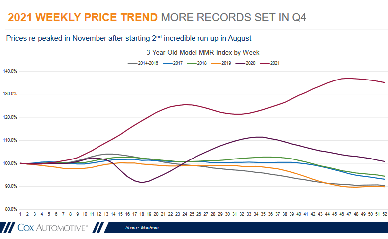 Typically, non-adjusted used vehicle prices drop in the second half of the year. And in December, the non-adjusted average declined by 1.1% from November and was up by 43.4% year-over-year, according to Manheim.