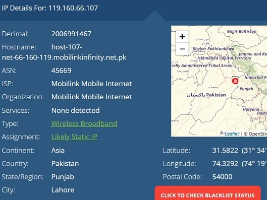 For example, Wolf Street receives a lot of spam comments (that are blocked). Each one has an IP address that allows me to check the geographic area where the spam got on the internet. For example, one of them had an IP address (119.160.66.107) that belongs to internet service provider Mobilink Mobile Internet in Pakistan, and the IP address is from its group of IP addresses in Lahore: