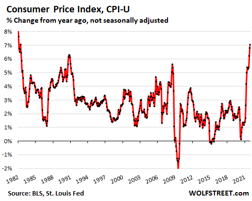 The broadest Consumer Price Index (CPI-U) jumped by 0.5% in December from November, and by 7.04% from a year ago, the highest since June 1982, according to data released by the Bureau of Labor Statistics today.