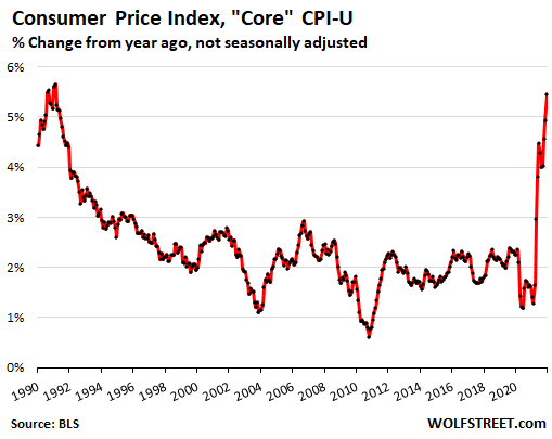 Inflation without food and energy – tracked by the “core” CPI – spiked by 5.5%, the most since February 1991. Food and energy prices can move with the volatile prices of the underlying commodities, and there have been some big surges among those commodities. But this “core” CPI shows how deep inflation has moved into the economy beyond prices that depend on volatile commodities.