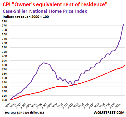 “Owner’s equivalent rent of residences” (makes up 23.5% of overall CPI), the stand-in for the costs of homeownership, is based on surveys that ask homeowners to estimate what their home might rent for. It rose 3.8% year-over-year (green line).