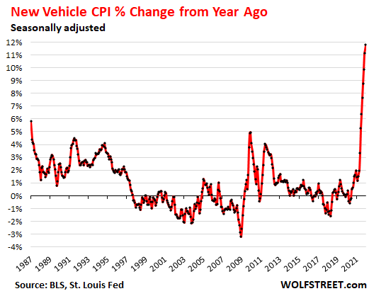 The CPI for new cars and trucks (3.9% in overall CPI) spiked by 11.8% year-over-year, the highest since 1975, and just below the two historic records set in 1975, as dealers have been selling new vehicles with addendum stickers of $2,000 or even $10,000 or more on top of MSRP. And consumers are paying no matter what as price resistance has completely fallen apart (chart shows the year-over-year % change):