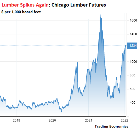 But wait… Lumber started spiking again almost as soon as it bounced off the bottom, nearly tripling in five months from the post-collapse August 2021.