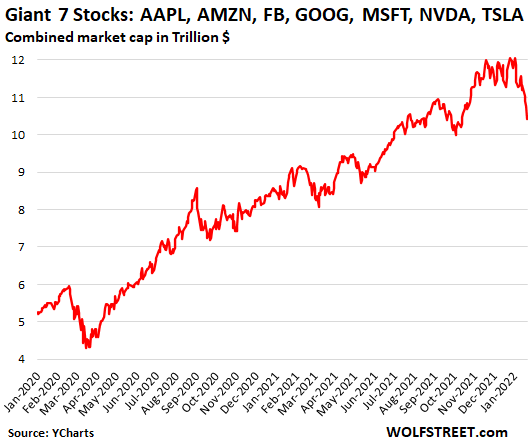 But now even the giants too are going over the cliff. Combined by market cap, the seven giants, Apple [AAPL], Amazon [AMZN], Meta [FB], Alphabet [GOOG], Microsoft [MSFT], Nvidia [NVDA], and Tesla [TSLA] peaked on January 3, and in the 13 trading days since then have plunged 13.4%. $1.6 trillion in paper wealth vanished (stock data via YCharts):