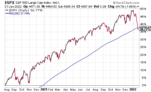 Since mid-2020 the S&P500 index of large US stocks has been a Wild Bull, raging up over 40% in just 18 months. But as Wolf reported yesterday, over the past 3 weeks the Wild Bull stumbled badly. The figure below shows the 18 months up to yesterday, when the S&P fell to its trailing 200-day “moving average”, a common measure of market health. Such stumbles are both rare and frightening, since trillions of dollars in digital wealth evaporate in only a few weeks.