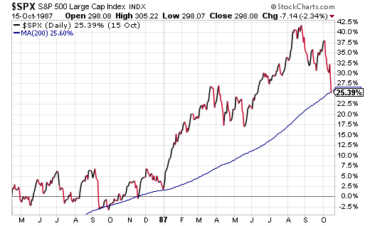But the Raging Bull of ’86 didn’t awaken a Hibernating Bear. The figure below shows how the bull bounced up along the 200-day average and then took off again. (This led to 1987 – more on that event in a moment.)