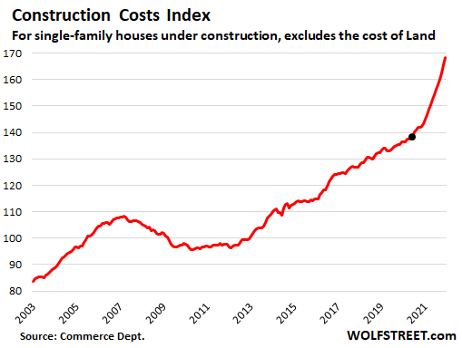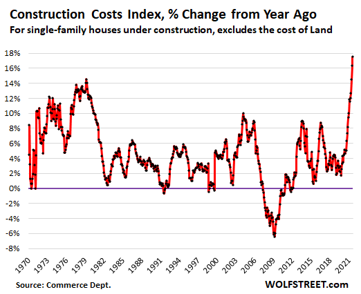 Construction costs of single-family houses spiked by 17.5% year-over-year in December, according to separate data from the Census Bureau today. This was the worst spike in the data going back to 1970. Compared to two years ago, construction costs are up 23.5%. These construction costs exclude the cost of land and other non-construction costs: