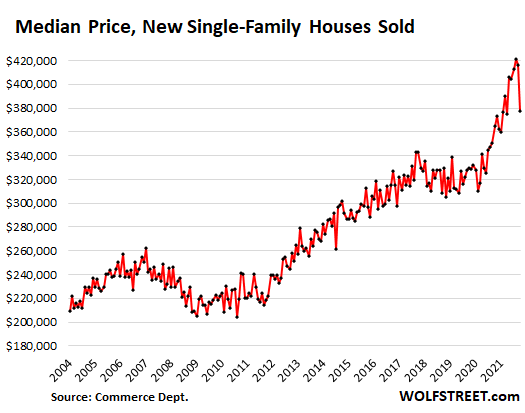 The median price of single-family houses sold in December plunged from $416,100 in November to $377,700 in December. This slashed the year-over-year price gains that had run in the 23% to 32% range since July to just 3.4%.