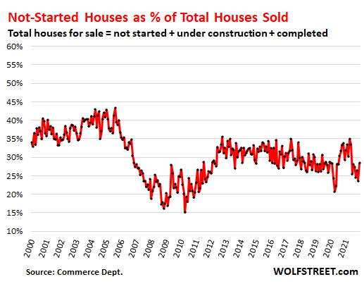 The share of not-started houses as a percent of total sales jumped to 28.5%, just a little below the middle of the range since 2021: