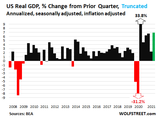 In the 4th quarter, “real” GDP, expressed in 2012 dollars, jumped by a seasonally adjusted annual rate of 6.9%. For a better view of the details, I truncated the two historic outliers, the 31.2% plunge in Q2 2020 and the 33.8% spike in Q3 2020: