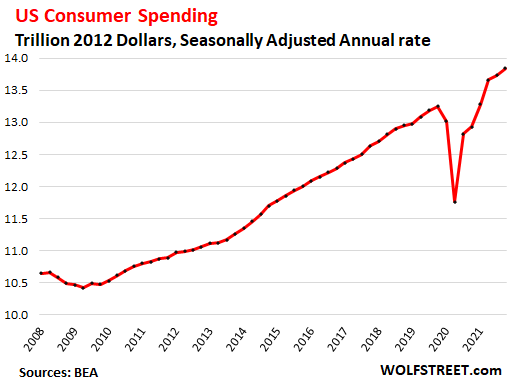 Consumer spending was still hampered in part by shortages of goods to buy, particularly a biggie: new vehicles. And spending on goods edged up by only 0.5% (annualized). But consumers made up for it by buying more services, where spending jumped by 4.7%.