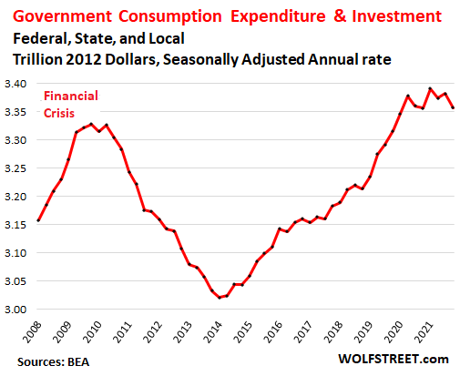 Government consumption and investment declined 2.9% (annualized), split up by a 4.0% decline by the federal government and a 2.2% decline by state and local governments.