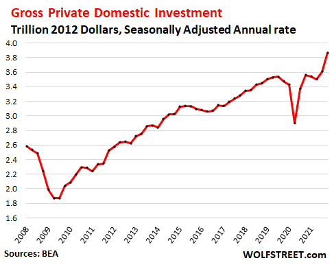 Gross private domestic investment soared by 32% (annualized), to a seasonally adjusted annual rate of $3.87 trillion. This category includes fixed investments, such as nonresidential structures, equipment, intellectual property, and residential structures. And it includes “change in private inventories,” and more on that in a moment.