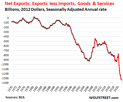 Exports add to GDP, imports reduce GDP. “Net exports” (exports minus imports) deteriorated due to soaring imports, which were fueled by consumer spending on durable goods.
