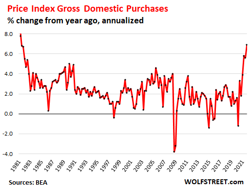 Rampant Inflation on the loose: The Price Index for Gross Domestic Purchases, the BEA’s inflation measure that roughly parallels its inflation adjustments to GDP, spiked in Q4 by an annualized rate of 6.9%, the worst inflation since Q2 1981. This is why the Fed is getting serious about inflation:
