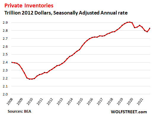 In Q4, private inventories jumped by $240 billion annualized rate to $2.83 trillion. A rise in private inventories is considered an investment and thereby increases GDP, while a drop in inventories reduces GDP. After having dogged GDP for the prior three quarters, inventories finally added some oomph – and there is likely more to come in 2022, as companies are trying to rebuild their inventories: