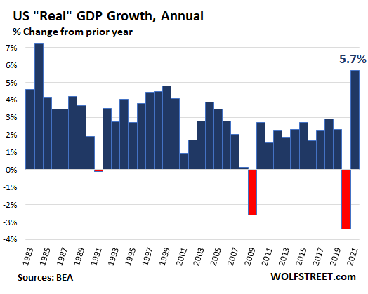 “GDP is adjusted for inflation to get “real” GDP by expressing everything in “chained 2012 dollars.” In this manner, real GDP in all of 2021 jumped to $19.43 trillion, up by 5.7% from a year earlier, the fastest annual growth since 1984, according the Bureau of Economic Analysis today.”