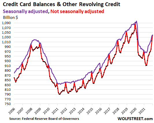 The biggest gains in compensation occur at the top, executives of major companies are getting raises that amount to millions of dollars, in addition to massive stock compensation packages. And many highly-paid employees at these companies are getting massive compensation increases in dollar terms, along with their stock compensation plans. Their stockholdings have ballooned since March 2020 in line with the Fed’s money-printing orgy. Those folks might grumble about higher costs, and shake their heads at the gas pump, but they will be fine in this crazy inflationary environment.