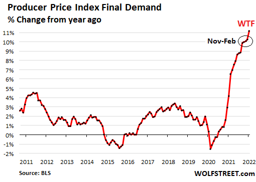 The Producer Price Index for Final Demand spiked by 1.4% in March from February, and by 11.2% from a year ago, both the biggest and worst spikes in the year-over-year data going back to 2010, the Bureau of Labor Statistics said today. After having been stuck at around 10% for four months in a row, producer price inflation has now broken out – to use a stock trading term.