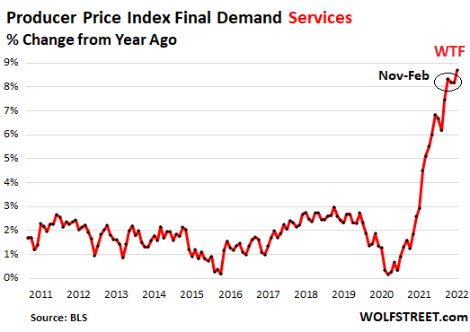 The PPI Final Demand tracks the input prices for consumer-facing industries whose selling prices are picked up in future months by the Consumer Price Index which yesterday, WHOOSH, already hit 8.5%. The PPI Final Demand shows what’s in store for the CPI in future months. And there is no “softening” in store, and it’s the PPI for services that has now started to spike.