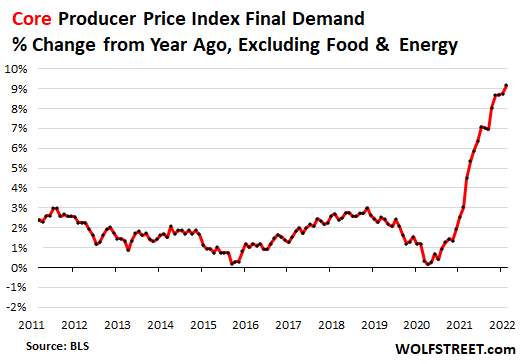 Without the volatile food and energy costs, the core PPI spiked by 1.0% in March from February and by 9.2% year-over-year, the highest in the data, having relentlessly pushed higher since late 2020: