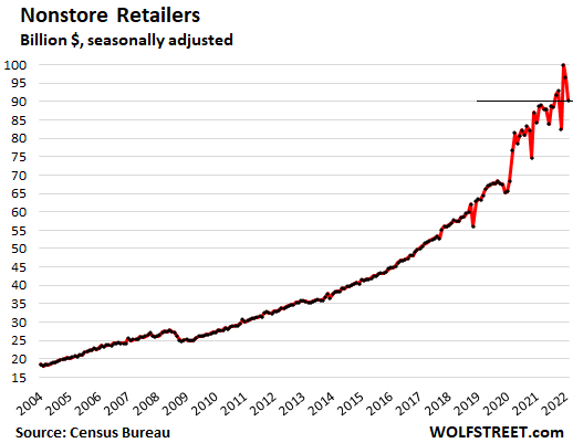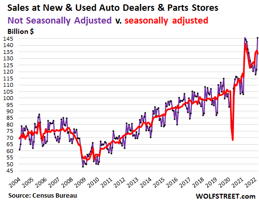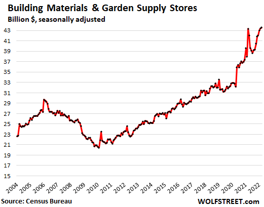 Gas stations, oh my, no surprises here: Sales spiked by 8.9% for the month, to a record $64 billion, seasonally adjusted, and by 37% year-over-year, driven entirely by the spike in gasoline prices.