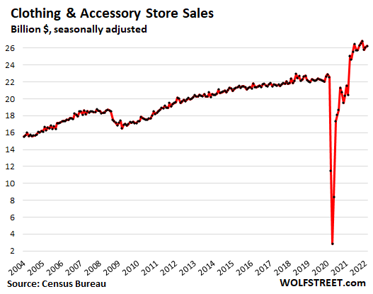 Clothing and accessory stores: Sales jumped by 2.6% for the month, and by 7.3% year-over-year to $27 billion, seasonally adjusted: