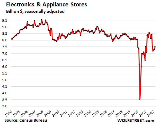 Electronics and appliance stores: Sales rose 3.3% for the month, to $7.5 billion, seasonally adjusted, but were down 9.7% from Stimulus Miracle March. This category covers specialty stores, such as Best Buy. Sales of consumer electronics and appliances are huge, but they’re spread over many types of stores, such as General Merchandise (above). And much of it has gone to ecommerce.