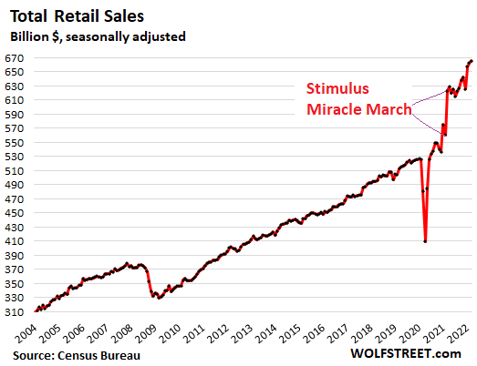Retail sales in March rose by 0.5% from February, seasonally adjusted, and by 16.8% not seasonally adjusted, to $677 billion, up by 7.0% from Stimulus Miracle March last year, when the stimulus checks got spent, sending retail sales into a dizzying spike.