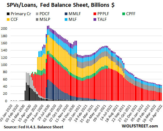 The PPP loans that the Fed bought from the banks account for $22 billion, about half of the total SPVs, down from $90 billion in July 2021. Over the summer and fall of 2021, the Fed sold all of its corporate bonds and bond ETFs into the hottest corporate bond market ever, and they’re gone (yellow columns, CCF). The remainder are the Main Street Lending Program ($12 billion), Municipal Liquidity Facility ($7 billion), and TALF ($2 billion):