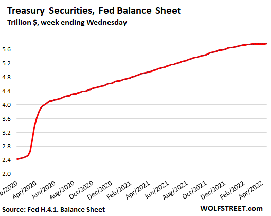 Since the beginning of March 2020, the Fed’s holdings of Treasury securities have ballooned by $3.24 trillion, to a total of $5.76 trillion. The balance has now remained roughly flat for several weeks.