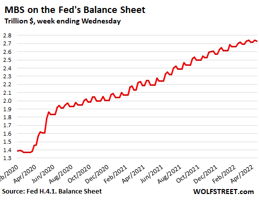 Trades in the TBA market take one to three months to settle. The Fed books its trades after they settle. So when the Fed was three months into the taper, that’s when the first tapered MBS purchases started showing up on its balance sheet. This is delayed data. And the MBS on the Fed’s balance sheet kept rising at the pace of purchases two to three months earlier.