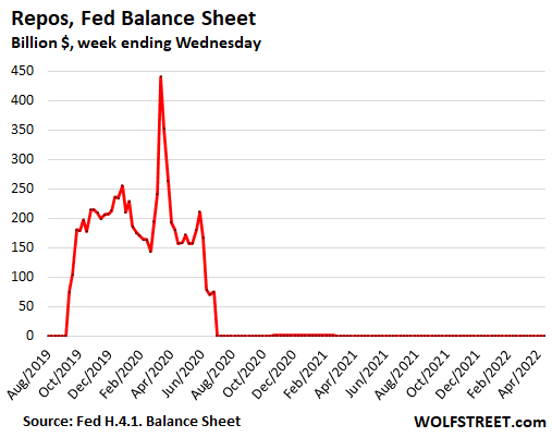 The Fed is still offering repos but has raised the rate it charges to be unattractive (currently 0.50%), and there have been no takers since July 2020, when the balance fell to zero.