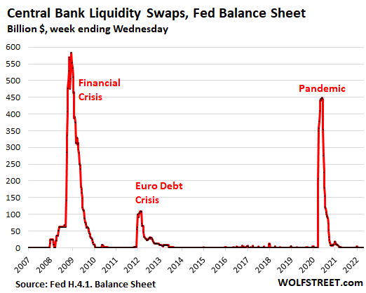 The Fed has been offering dollars to 14 other central banks via “central bank liquidity swaps,” in exchange for their currency, to provide dollars to those economies for their dollar-funding requirements. The Fed did this during the Financial Crisis in 2008-2010, during the Euro Debt Crisis in 2011-2013, and during the pandemic.