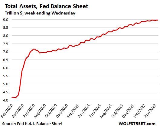 Total assets on the Fed’s weekly balance sheet as of April 20, released this afternoon, declined to $8.955 trillion, roughly the same as on March 16 and below the levels of March 23 and April 13. Beyond the week-to-week ups and downs, caused by the peculiarities of Mortgage Backed Securities (MBS), which we’ll get to in a moment, the balance sheet has flattened out. Balance sheet growth has ended. QE has ended. That part of the marvelous show is over.