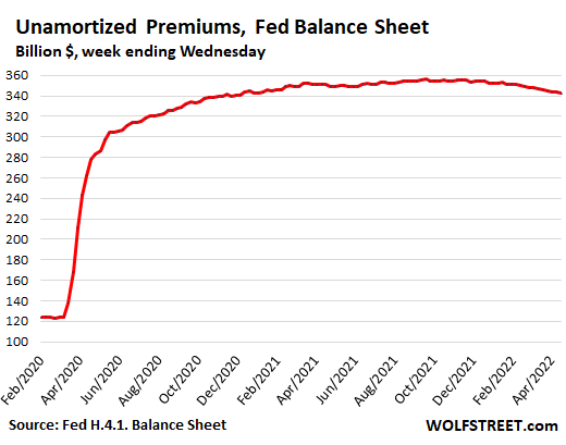 This is the net amount that the Fed paid in “premiums” over face value and in “discounts” below face value when it purchased Treasury securities, MBS, and agency securities in the market. The net unamortized premiums peaked in November 2021 at $356 billion and has now declined to $342 billion.