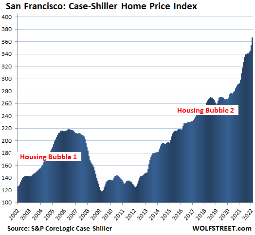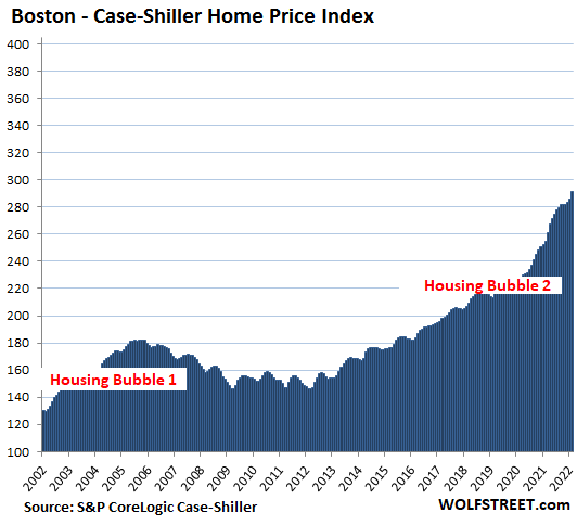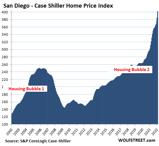 San Diego metro: Prices of single-family houses spiked by a holy-moly 4.5% in “February” from the prior month, and 29.1% year-over-year. The index value of 401 means that home prices exploded by 301% since January 2000, when the index was set at 100.