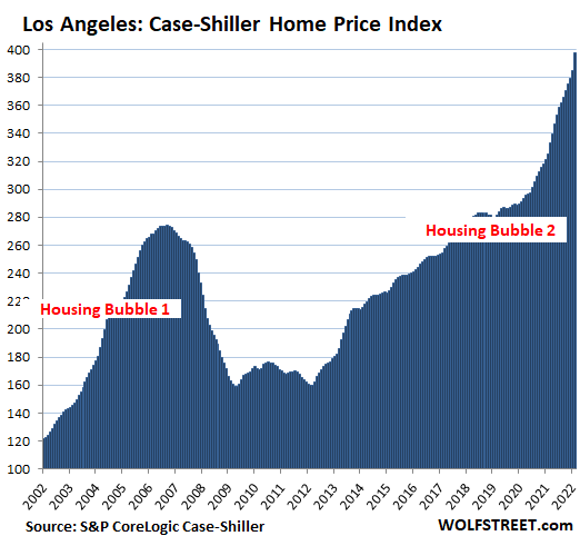 Los Angeles metro: The Case-Shiller index spiked by 3.2% in February from January and 22.1% year-over-year. With an index value of 397, house prices exploded by 297% since January 2000, crowning the Los Angeles metro as the Number 2 most splendid housing bubble on this list.