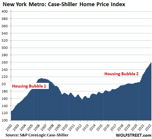 New York metro: +1.1% for the month, and +12.9% year-over-year. At an index value of 259, the metro has experienced 159% house price inflation since January 2000, compared to 70% CPI inflation.