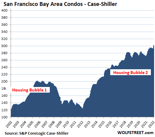 San Francisco Bay Area: Houses and condos have separated a few years ago, with condo prices lollygagging around, and house prices spiking. The Case-Shiller Index provides separate data for condos and houses for the five-county metro.