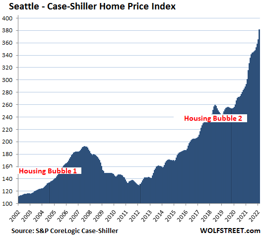 The home price data in the charts below does not yet reflect any part of the spike in mortgage rates that commenced in January. But it reflects the crazed run-up beforehand when buyers were desperately trying to buy a home with their still low rate locks.
