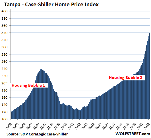 Tampa metro: House prices spiked by 2.7% for the month, and by 32.6% year-over-year, another record spike for the Tampa metro, wiping out the record spikes in the prior months, and out-spiking the crazy spikes on the eve of the housing bust: