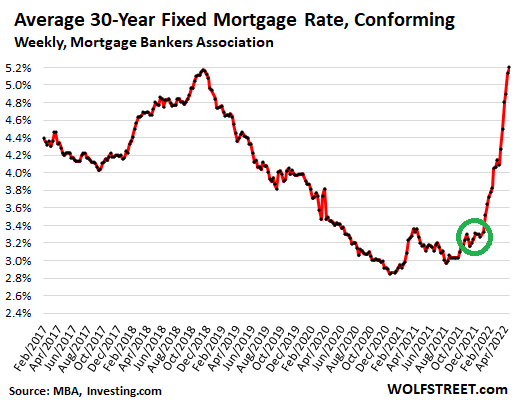 But wait… Many of these homebuyers were pre-approved and had rate locks from prior weeks and months. In November and December last year, the average 30-year fixed rate hovered at around 3.2%, according to Mortgage Bankers Association data, which is when homebuyers got the rate locks for most of these deals in today’s data (green circle in the chart):