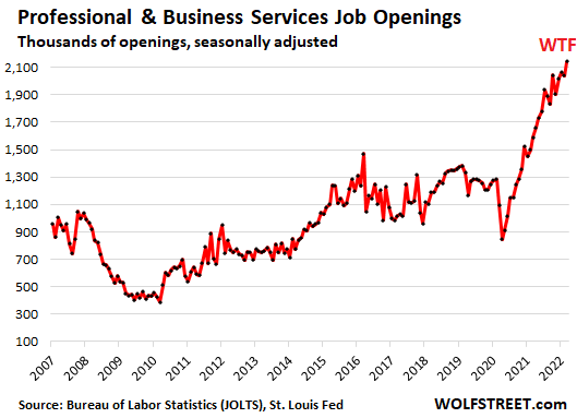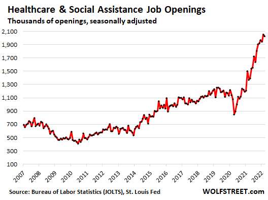 Healthcare and social assistance is now the second largest category in terms of job openings – an industry that is beset by shortages of nurses and doctors. Job openings in March dipped a tad from the record in February, to 2.03 million, up by 48% from a year ago, and up by 62% from March 2019: