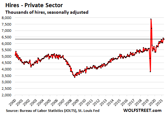 Hiring, thanks to the quits and the churn, has been brisk as well, with 6.33 million people getting hired, and hired away from other employers, up by 9% from a year ago, and up by 19% from March 2019: