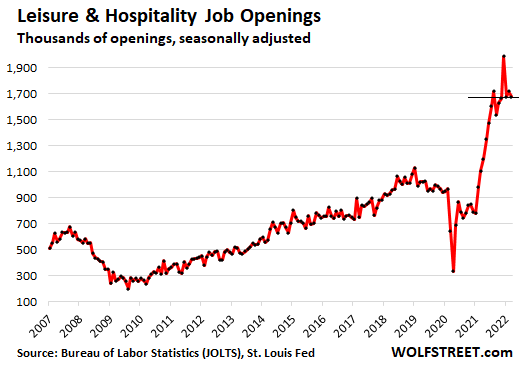 In leisure and hospitality, the third largest category, job openings eased further from the spike last December, to 1.67 million, but remain desperately high, up 51% from a year ago, and up 64% from March 2019:
