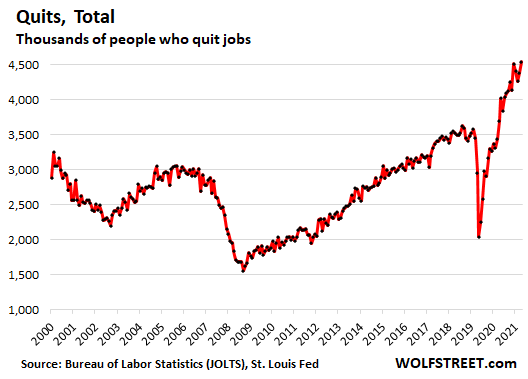 And so the number of “quits” jumped to another record, to 4.54 million workers who voluntarily quit their jobs in March, up by 23% from a year ago, and up by 29% from March 2019. Quits is a sign of labor force churn, and it’s the mechanism by which wage increases spread across the economy: