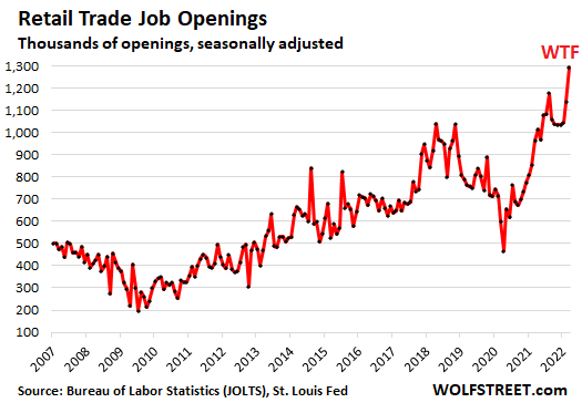 In retail trade, the fourth largest category, job openings spiked to a new record of 1.29 million, up 34% from a year ago, and up 70% from March 2019!