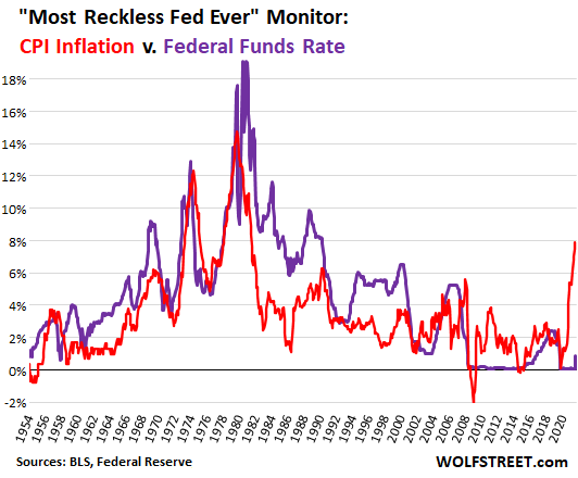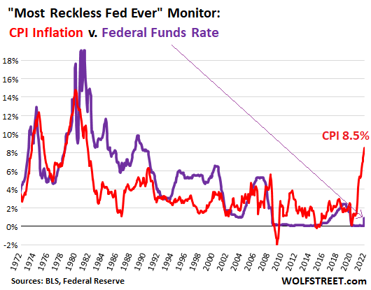 But CPI inflation is now 8.54%, and the “real” EFFR is now a negative 7.67%, which represents the amount by which the Fed has fallen behind, and it’s unprecedented. OK, lots of stuff is “unprecedented” in our crazy times, but this sticks out, and it means that the Fed continues to pour fuel on the raging inflation fire, which makes it the Most Reckless Fed Ever.
