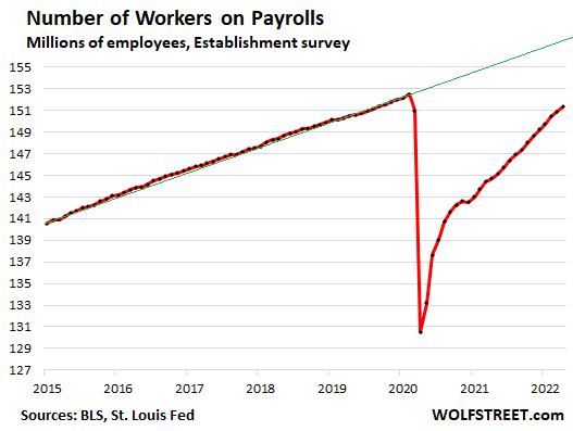 But the number of employees remains far below pre-pandemic trend (green line), and remains below the peak just before the pandemic: